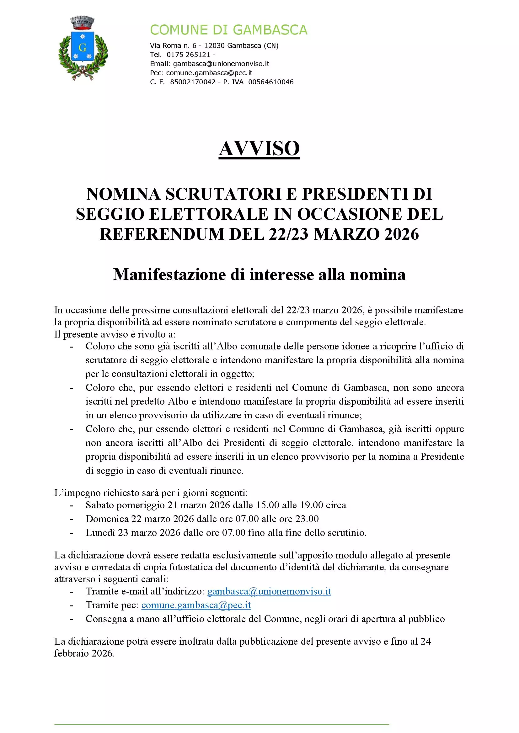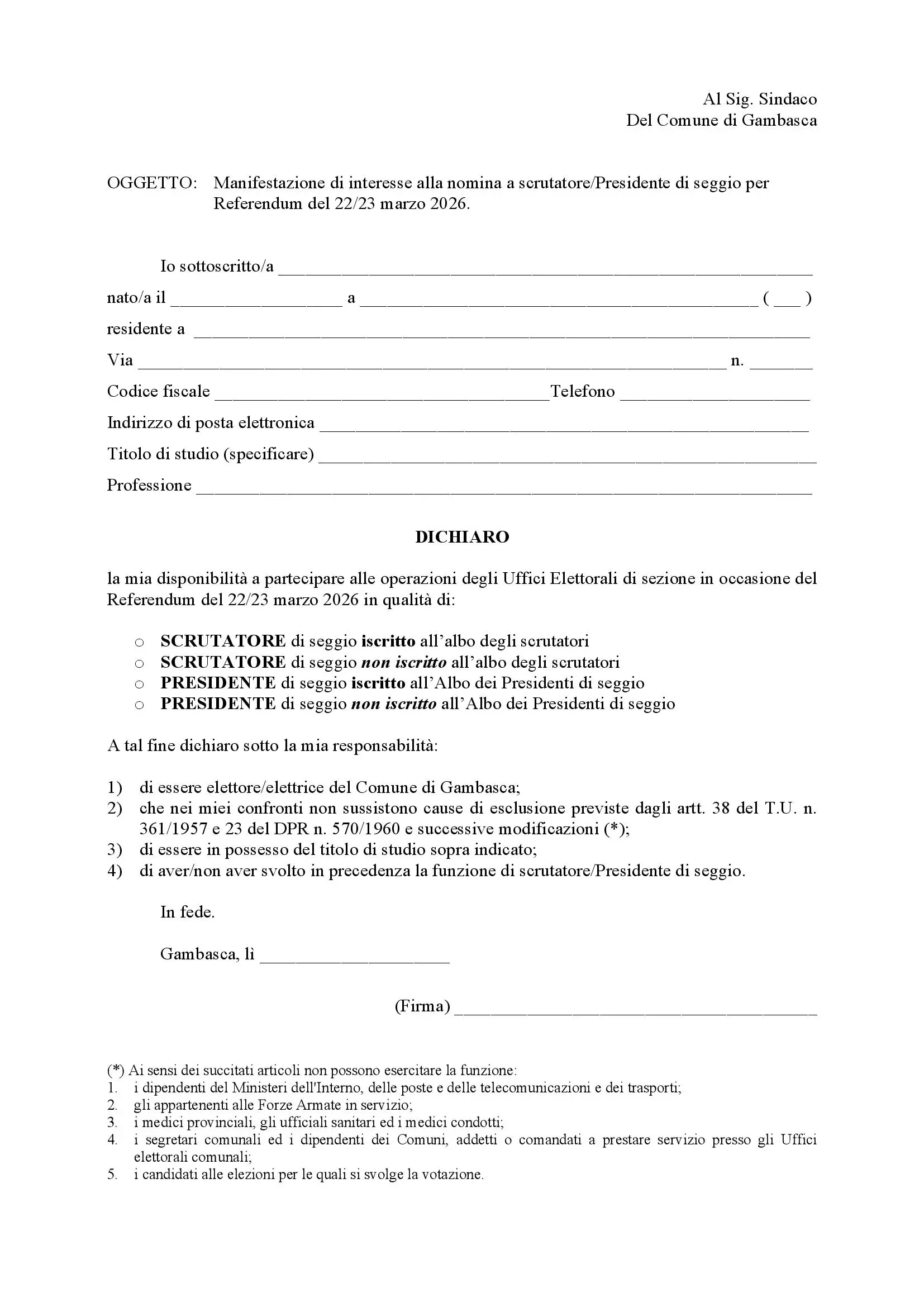Descrizione Referendum del 22-23 marzo 2026. Manifestazione di interesse alla nomina a componente di seggio